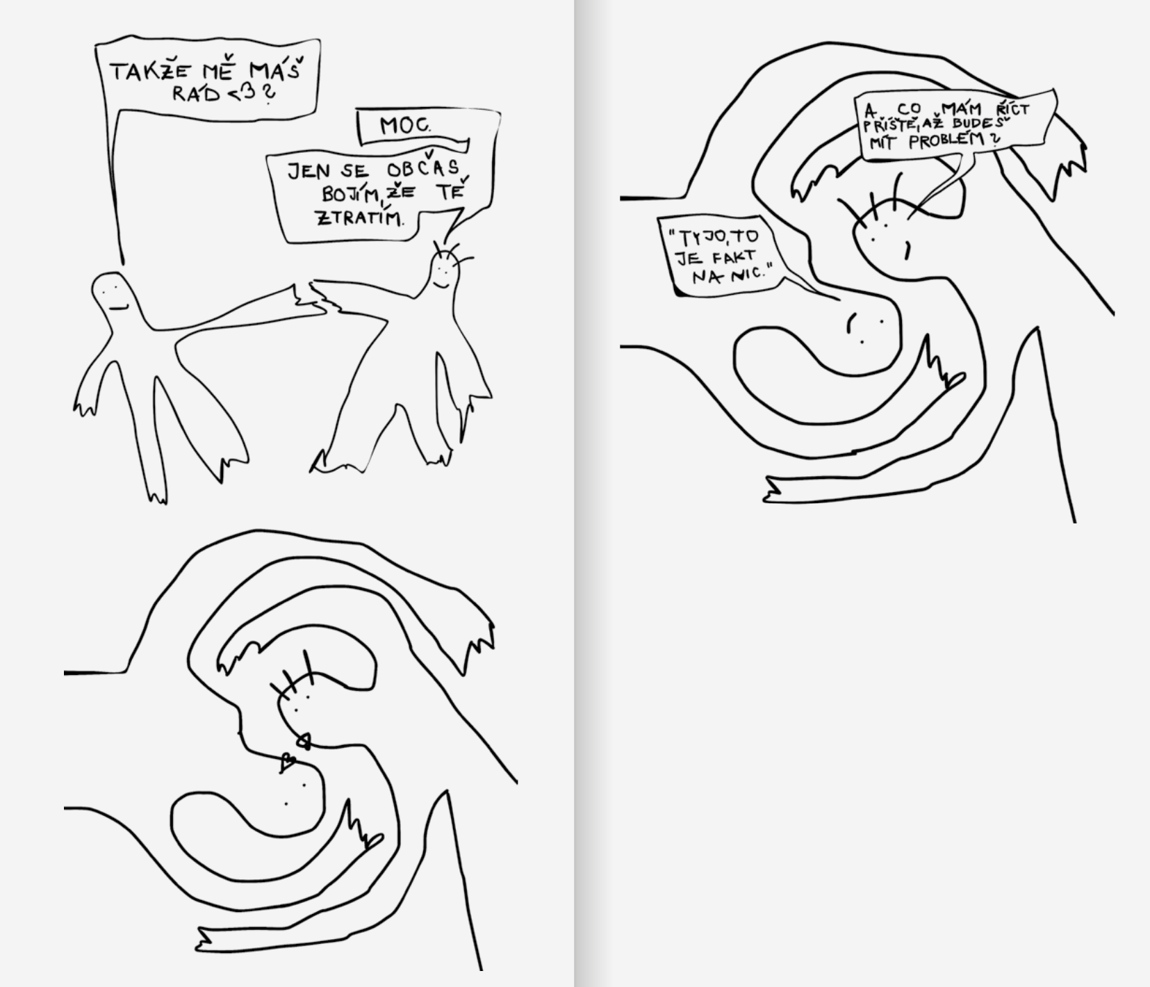 Postavičky v Eljových kresbách intuitivně hledají odpověď na otázku „jak funguje život?“ Zkouší pracovat se svými emocemi, komunikovat svoje potřeby, nastavovat si zdravé hranice a hlavně se spolu s ostatními podporovat místo toho, abychom proti sobě bojovalx.